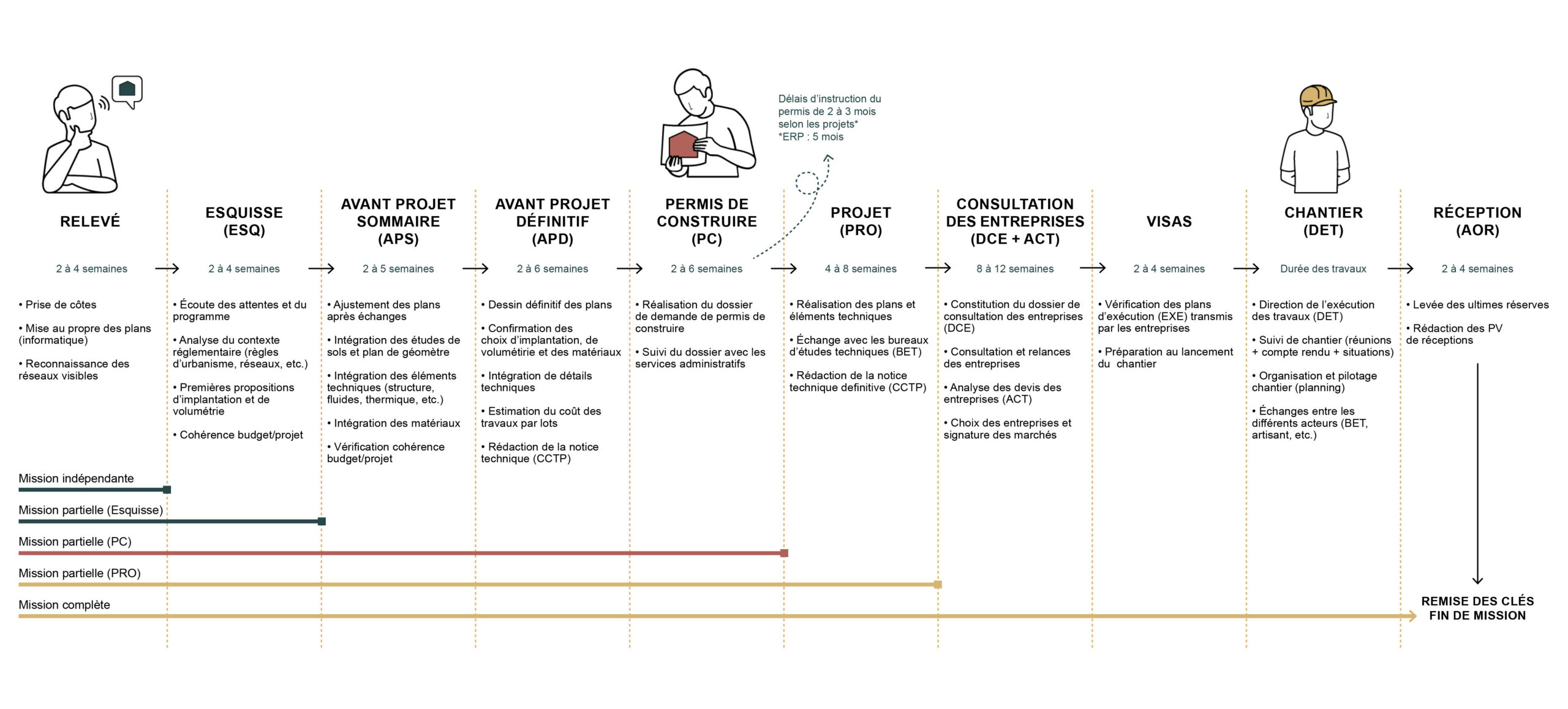 La mission, encadrée par un contrat, s’achève à la réception de l’arrêté de permis de construire par le maître d’ouvrage reçu lors du dépôt en mairie.